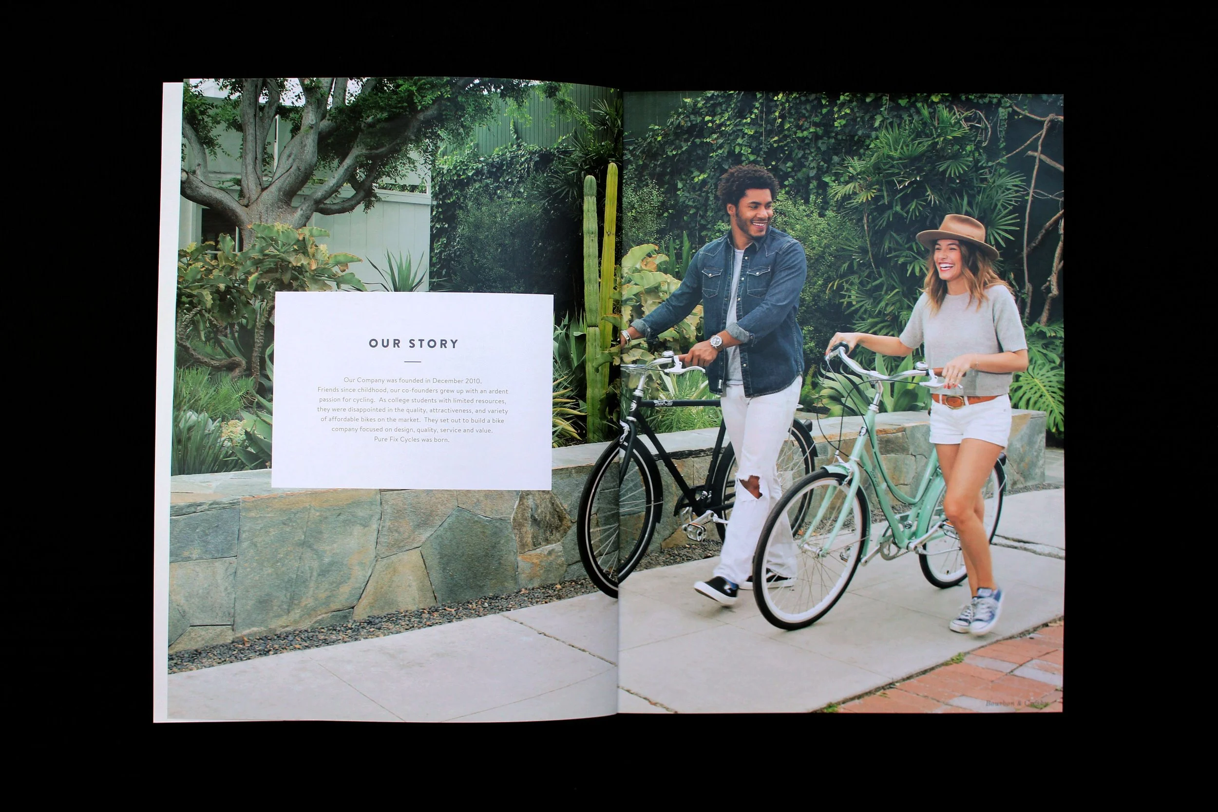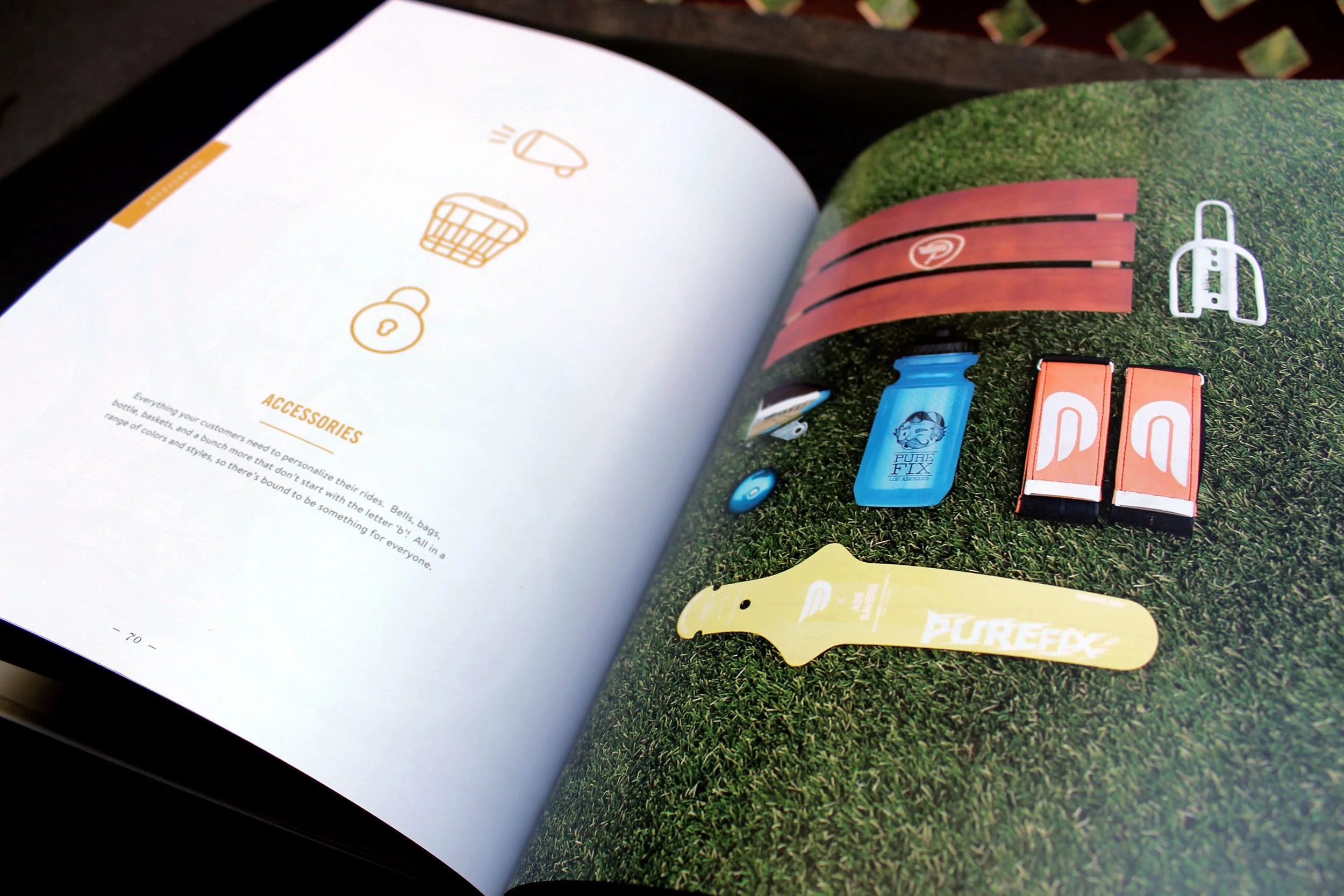 Pure Cycles was in need of creating their 2015 Seasonal Catalogue of their entire line of products for Dealers and Consumers. The entirety of the Creative Department collaborated in the creation of this catalogue. Involved throughout the creative process of pitchboard creation, mockups, product photography, finalized catalog Layout and Printer Selection- the following catalogue was made.